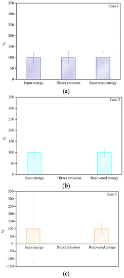 Meanwhile, a sensitivity analysis was carried out by modifying the relevant input and output from 90% to 110% to check its impact on the carbon footprint. Input energy, direct emission, and recovered energy were chosen as the variables. Figure 3 presents the sensitivity analysis result of the three cases.The higher the slope of the line, the higher the sensitivity.