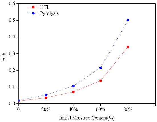 ECR for HTL and pyrolysis of SS with varying initial moisture contents.