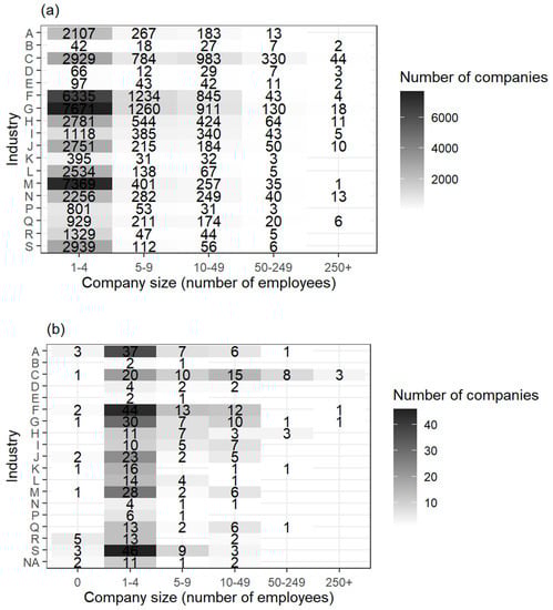 Distribution of companies across industries and company size: (a) Population, n = 56,298; (b) Survey sample, n = 532.