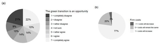 Survey answers to the questions: (a) 2.1. How much do you agree with the following statement? “The green transition means an opportunity.” (n = 532); (b) 2.2. How are the costs of your company expected to change as a result of the green transition? (n = 446, NA = 86).