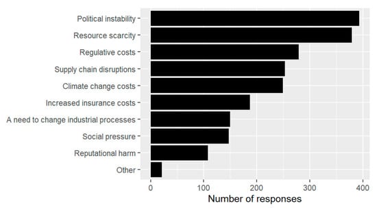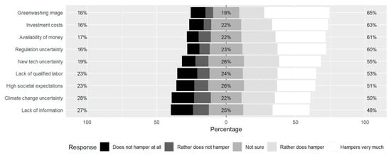 Furthermore, according to Figure 3, the respondents perceived that their company’s business development could be mostly hindered by political instability, resource scarcity, and regulative costs. Additionally, Figure 4 reveals that aside from the risk of a greenwashing image, the green transition is perceived to be hampered mainly by investment costs, availability of money, and regulatory uncertainty. Such findings imply that the movement towards a carbon-neutral Europe is mostly seen as a costly challenge arising from policymakers.