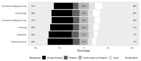 A survey conducted by Ibec in collaboration with the Environmental Protection Agency (EPA) in Ireland [33] found that businesses view the transition towards a sustainable Europe as a source of business opportunities and local employment, including in Ireland. Progressive companies that embrace this new mentality are poised to become technological leaders in their respective industries. The survey results revealed that approximately half of the participating companies saw the transition to a circular economy as a long-term opportunity for their organization, though the potential business risks must also be considered.