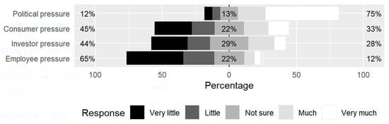 Furthermore, as depicted in Figure 5, most the respondents believe that their company will not reap any benefits from the transition to green practices. The respondents hold particularly negative views about market expansion. This could be due to concerns that some competitors may obtain an advantage in adapting to green regulations, and the increased bureaucracy might create entry barriers as well. Lastly, Figure 6 reveals that the pressure toward the green transition is predominantly perceived to be emerging from politicians.