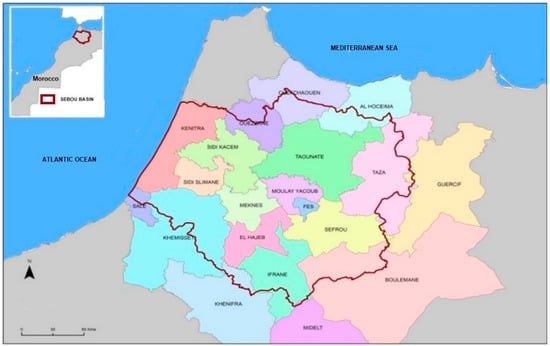 To conduct this study, we chose the Sebou hydraulic basin in Morocco, which is considered to be the basin most impacted by OMWW [7]. Oil mills are distributed across almost the entire basin, with marked concentrations in the provinces of Taounate, Meknes, El Hajeb, and Fes. The study area is represented in Figure 1.