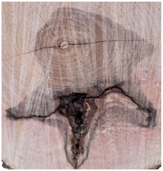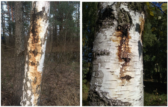 Figure 1). Shoots on the affected tree trunks indicate a deep pathology. Chronic pathogenesis is accompanied by the death of the upper part of the plant and, in the future, the death of a weakened tree. The initial diagnostic sign of bacterial wetwood is the appearance of dieback in stands with low crown density. For example, traces of the vital activity of bacteria appear on trees affected by bacterial wetwood. They are weeping reddish spots. Signs of bacterial infection usually appear in the spring or early summer. Certain secretions accumulate under the bark, forming a swelling on the trunks that becomes visible. The bast and wood in the affected areas become wet, acquiring a dark brown color and a sour smell. Birches with coarsely fissured and longitudinal bark are distinguished by the peculiar fermentation odors and brown exudate emerging from cracks.