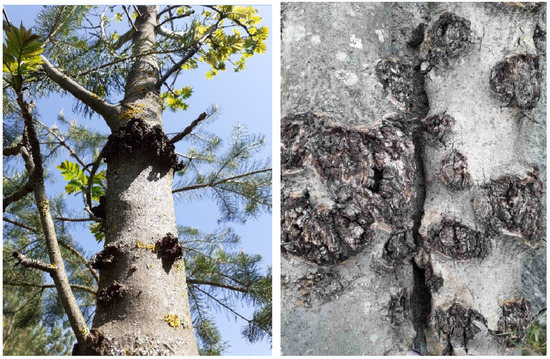 Bacterial poplar canker. The first signs of the disease are well visible on the 1–2-year-old branches and coincide with the time of the spring pruning of trees. Tree trunks and branches are affected. This phenomenon takes place in early spring and early summer. Small blisters are formed at the base of the branches, at the level of the internodes, near the affected shoots. Later, they open with cracks, sometimes forming ulcers. Ulcers can be small (1–3 cm) and nodular, called “closed ulcers”. However, typically, they are large (from 1 to 15 cm) and elongated, called “open ulcers”. The wood under the affected area has a light red color. The bast fiber has a dark gray color. In cross-section, the cortex and part of the cambium are translucent. The rapid progression of the disease is visualized with the necrosis and the dieback of the branches. The slow one causes the formation of bark roller growing over the years. The most intensive development of tumors and ulcers is observed in May. In August, it is practically absent. The vital activity of buds weakens on the affected trees. They show dieback. Flower buds do not open. The affected ones become oily, dark brown, and fall off prematurely.