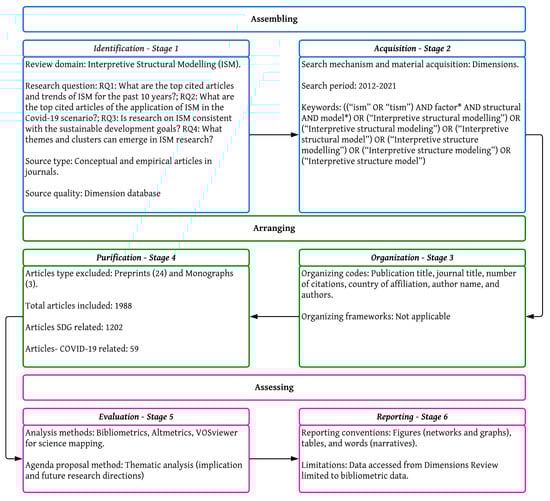 The first step in the process is called “assembling” and involves gathering publications for review. In this study, the Dimension database was used for this purpose. The search was conducted by using the search term provided in Figure 2 in the title and abstract on 29 November 2022. The search resulted in a list of 1988 publications from 2012 to 2021.