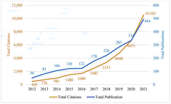 The growth of ISM-related publications over the years reflects the field’s dynamic and rapidly evolving nature. Figure 2 displays the number of publications and citations received each year. To answer RQ1, we analyzed the publication patterns in the ISM literature between 2012 and 2021 by using the data collected for the number of total publications and citations. The results show a yearly increase in both the number of publications and the number of citations. The highest number of publications, 494, was recorded in 2021, and the most citations, 10,503, were received in the same year, surpassing the number of citations received in 2020 (6655 citations). These findings highlight that 2021 was a particularly productive year for research in the field of ISM.