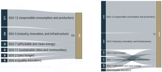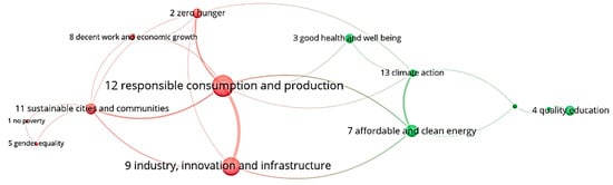 In our study, a cocitation network was created to reveal the linkages between the SDGs as measured by citations (Figure 4). The proximity between the SDGs on the network indicates their similarity in terms of cocitation occurrence, meaning that publications from the two SDGs are often cited together in the same set of publications. The nodes’ sizes reflect the SDG frequency in terms of overall publications, and the thickness of the edges shows how often these SDGs are cocited. Two clusters of SDGs were identified: Cluster 1 (red) includes SDGs that have a strong industrial and economic growth orientation, such as SDG 12 (responsible production), SDG 9 (industry and innovation), SDG 11 (sustainable cities), and SDG 8 (economic growth). Cluster 2 (green) groups SDG 7 (clean energy) and SDG 13 (climate action), possibly focusing on the environmental aspects, along with linkages to SDG 3 (health) and SDG 4 (education).