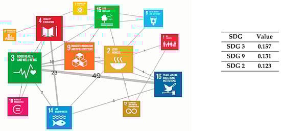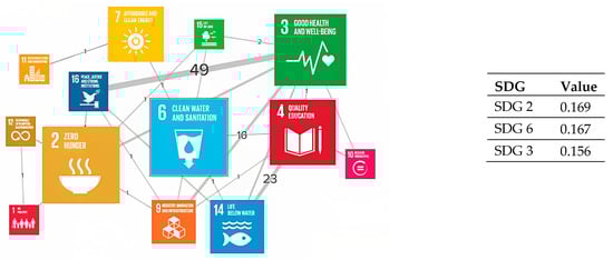 Figure 5 displays the three SDGs with the highest betweenness centrality in the field of ISM research. The thickness of the links between the two goals on the map represents the strength of the connection between the two SDGs. The strongest links are between health and peace (SDG 3, 16), between health and hunger (SDG 3, 2), between education and life below water (SDG 4, 14), and between health and industry (SDG 3, 9). The figure highlights the central role of SDGs 2, 6, and 3 in the network.