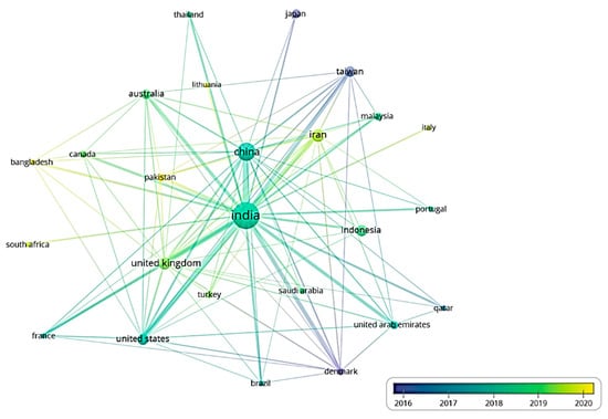 Science-mapping tools are a fundamental aspect of bibliometrics. Bibliographic coupling, the most widely used citation-based method in science mapping, is especially useful for analyzing the growth of new research fields and tracking recent research trends [,]. This method is well suited for capturing emerging patterns in a field because it is forward-looking [,]. The present study combined country and journal bibliographies to determine the similarity between the cited articles, and it applied a network analysis to identify research hot spots and changes over time and to gain insights into new research areas []. The visualization tool VOSviewer was utilized to map and highlight the temporal and structural features of the corpus of scientific research, and it has been commonly used for science-mapping purposes [,,,,].