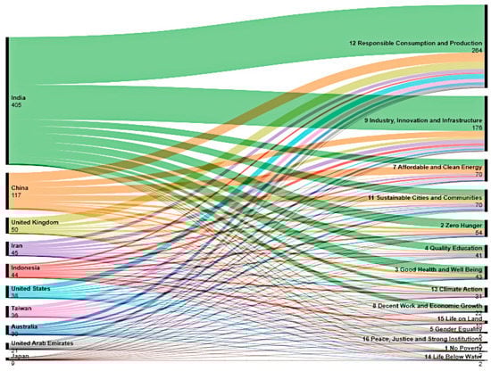 According to Figure 8, India has the highest number of publications mapped to the highest number of SDGs. SDG 12 (responsible consumption and production) and SDG 9 (industry, innovation, and infrastructure) are the most frequently mapped SDGs among the top contributing countries.