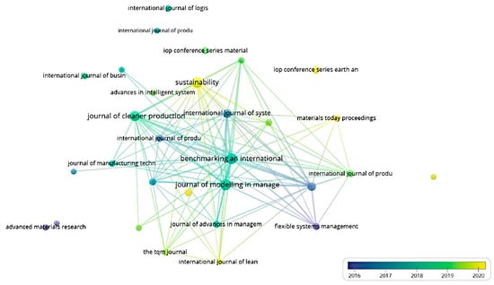 The overlay visualization of the most frequently cited journals in the ISM field is presented in Figure 9. This figure displays the similarity between different journals on the basis of the ISM publications that they cite. The closer the journal nodes, the more similar their cited ISM publications. The figure shows a strong connection between Sustainability and the Journal of Cleaner Production, the International Journal of Production Research, Benchmarking: An International Journal, and the Journal of Modelling in Management. Additionally, a large number of ISM-related publications appeared in the journal Sustainability post-2020, as well as in Benchmarking between 2017 and 2019. These findings highlight the strong connections between certain ISM journals and indicate where future research in this field may be directed.