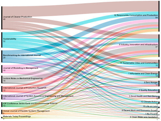 According to Figure 10, the Journal of Cleaner Production has the highest number of publications mapped to 12 SDGs. Among the top-cited journals, SDG 12 (responsible consumption and production) and SDG 9 (industry, innovation, and infrastructure) are the most frequently mapped SDGs.