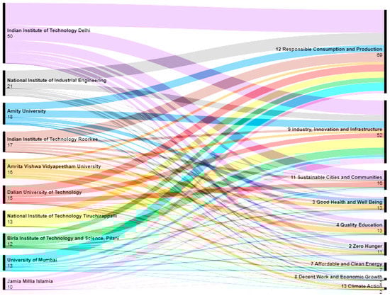 As seen in Figure 11, the Indian Institute of Technology Delhi has the highest number of publications mapped to SDGs, where SDG 12 has the most. Among the top-cited journals, SDG 12 (responsible consumption and production), SDG 9 (industry, innovation, and infrastructure) are the most frequently mapped SDGs.