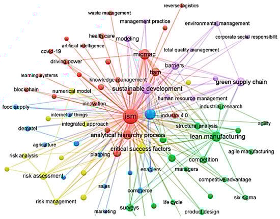 The visualization in Figure 12 shows the connection between different keywords and the topics related to ISM. The keywords are grouped on the basis of their relationship and frequency of occurrence in the literature. The size of each node represents the frequency of occurrence, while the strength of the connection between nodes represents the co-occurrence relationship. The keywords related to ISM can be seen as clusters, where the strongest connections are in the center of the network. This information provides a clear picture of the main topics and subtopics related to ISM and their relationships. By visualizing the keywords network, researchers can obtain an understanding of the research structure and the trends in the ISM field.