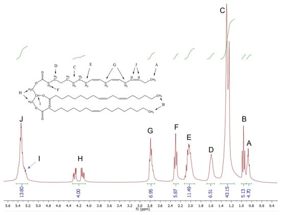 The epoxidation of the vegetable oil was carried out using a well-established method [33], which uses a Prilezhaev-type reaction, with the in situ generation of the peracid [34]. LO (10 mL), acetic acid, and 50% (vol.) sulfuric acid are mixed in toluene solvent (15 mL). The corresponding volume of H2O2 is then added dropwise, under stirring at room temperature. After all the H2O2 is added, the temperature is raised to 60 °C, and the reaction mixture is kept under constant stirring for 24 h. The molar ratio of double bonds to acetic acid to H2O2 is 1:2:10, with the average unsaturation of the LO being 6 double bonds per triglyceride molecule, determined using a 1H NMR method [35] (Figure 1). After the completion of the reaction, the organic and aqueous phases were separated. In order to remove traces of acetic acid and hydrogen peroxide, the organic phase was washed with distilled water and saturated sodium bicarbonate solution until a neutral pH was reached. The organic solvent was then evaporated under vacuum, obtaining a semisolid white product (95% quantitative yield). The epoxidation was considered quasi-total, based on comparing the 1H NMR spectra of the LO and ELO [36].