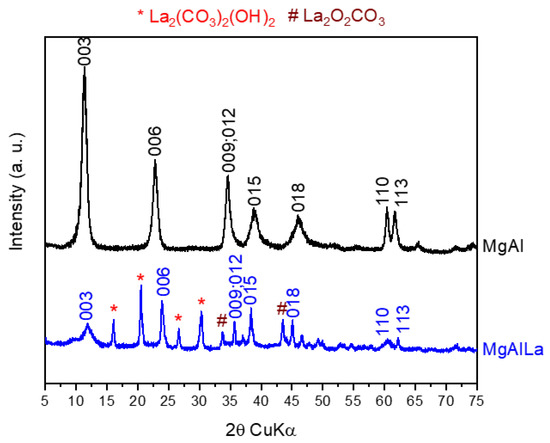 The hydrotalcite sample (MgAl) showed diffraction lines corresponding to the typical structure of layered materials without the detection of other contaminating phases (Figure 2, black line). The sample modified with lanthanum displayed diffraction lines of very low intensity corresponding to the phases of La2O2CO3 (JCPDS card 23-0320) and La2(CO3)2(OH)2 (JCPDS card 70-1774). The very strong electronegative character of La (1.1 in the Pauling scale) favors the formation of carbonate-type species as soon as the hydrotalcite synthesis process starts. At the same time, the large ionic radius of La3+ (1.032 Å) prevents intercalation of the large lanthanides species in hydrotalcite galleries. The insertion of La into the octahedral positions of LDH was not performed considering the fact that the network a-parameter does not undergo any significant changes (3.060 Å for MgAl and 3.062 Å for MgAlLa). Instead, the decrease of the network c-parameter from 23.357 Å (MgAl) to 22.226 Å (MgAlLa) was not due to the presence of lanthanum, but rather to the smaller amount of aluminum that was involved in the construction of the layered structure. Mostly, the quantity of lanthanum was placed on the surface of the layered material in the carbonate oxide/hydroxide forms, but at the same time the presence of contaminants was not excluded even in the galleries, a fact supported by the I006/I003 ratios that increase from 0.43 Å to 1.23 Å. At the same time, the presence of La led to a decrease in the crystallinity from 84 Å to 38 Å.