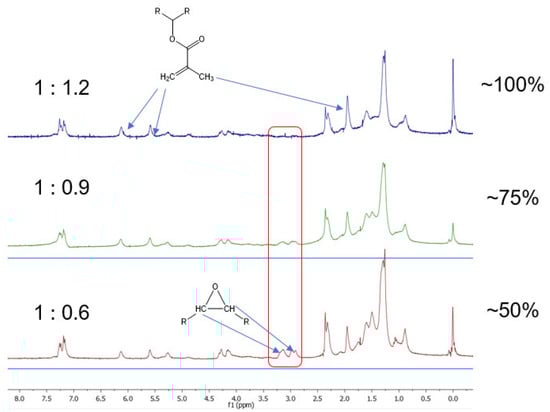 where C is the conversion (%) of ELO, A is the peak area of the epoxy signal in the product and B is the peak area of the epoxy signal in ELO. The result can be confirmed by the peak area of the signals specific to the product (-CH3 protons in the methacrylate at 1.96 ppm and =CH2 proton of the methacrylate at 5.59 and 6.11 ppm). This general method was applied for calculating conversions for all the epoxy ring-opening reactions in the present study.