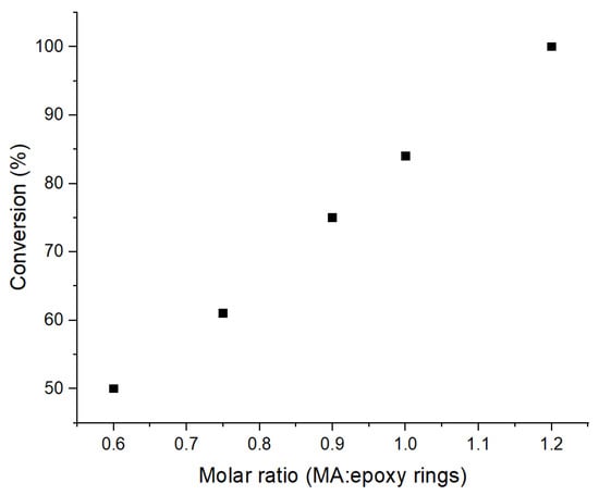 For partial opening the epoxy rings, different molar ratios between epoxy and MA were used (Figure 3). For a ratio of 1:0.9 (epoxy groups:MA), the conversion of the epoxy groups was around 75%, while for a 1:0.6 ratio, the conversion was 50%. This trend continues at various molar ratios, as seen in Figure 4. As a general method, the conversions were calculated by comparing the peak areas of the epoxy signals in ELO and in the ring-opening products. In order to have comparable and quantifiable results, the method used is based on the integration of the signals of the glycerol protons in α positions (4.14–4.27 ppm) and β position (5.26 ppm) and using them as internal standards, due to the fact that the glycerol backbone remains unchanged during the reaction. This means that peak areas in both spectra can now be compared (for details, see Figure S4), and the conversion can be calculated using the epoxy signals with the following formula: