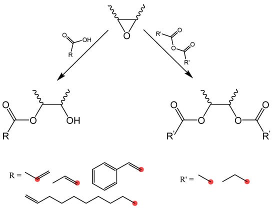 Various ring-opening reagents have been used to functionalize epoxidized vegetable oil. However, unsaturated carboxylic acids are of particular interest due to the possibility of further reacting/functionalizing the double bonds. Other promising ring-opening reagents are carboxylic anhydrides, due to their high reactivity and the potential uses for the obtained products, such as lubricants in the case of vegetable oils functionalized with monocarboxylic anhydrides [6]. Unsaturated carboxylic acids and carboxylic anhydrides with interesting properties were chosen for this study (Figure 5). The ring-opening reactions using acids are further outlined (reaction conditions and conversions) in Table 1.