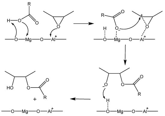 The experimental results demonstrated that the increase in basicity from 6.73 mmol AA·g−1 to 8.62 mmol AA·g−1 for the catalyst modified with lanthanum played an important role in conversion. This significant increase was due to the fact that the electronegativity presented by La (1.1 on Pauling’s scale) is much lower compared to that presented by Mg (1.31) and Al (1.61), respectively. Even if La does not isomorphously substitute Al in the octahedral sites of the layered structure, its presence in the network in the contaminant form (lanthanum hydroxycarbonate; JCPDS card 70-1774) leads to this significantly increased basicity. This base character corroborated the large ionic radius of La (1.14 Å) [44] (which can lead to larger pore size in the catalyst, facilitating the access of the reactants to the active sites), leading to a higher level of catalytic activities. In accordance with previous studies in the literature [21,45,46], a concerted reaction mechanism was proposed (Figure 6). This considers the influence of both base and acid sites, which can explain the differences in conversions between different catalysts and ring-opening reagents and further confirms that catalysts with an acid-base character such as LDH are suitable for this type of reaction.