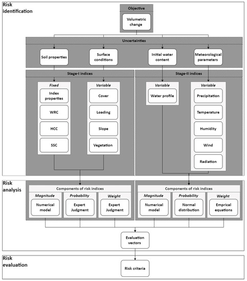 Figure 2 gives the flow chart of the risk modeling process. The objective was defined as the volumetric change of soil in the vertical direction. The uncertainties included four distinct event categories: soil properties, surface conditions, initial water content, and meteorological parameters. These uncertainties were described by Stage-I indices with a non-quantifiable effect on the objective and Stage-II indices having quantifiable effect on the objective.