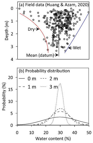 Analysis of initial water content: (a) field data and (b) normal distribution functions at selected depths [30].