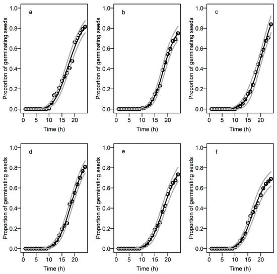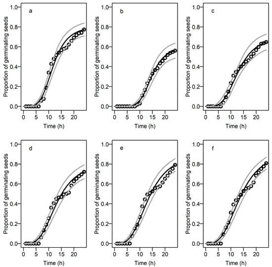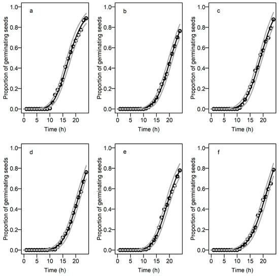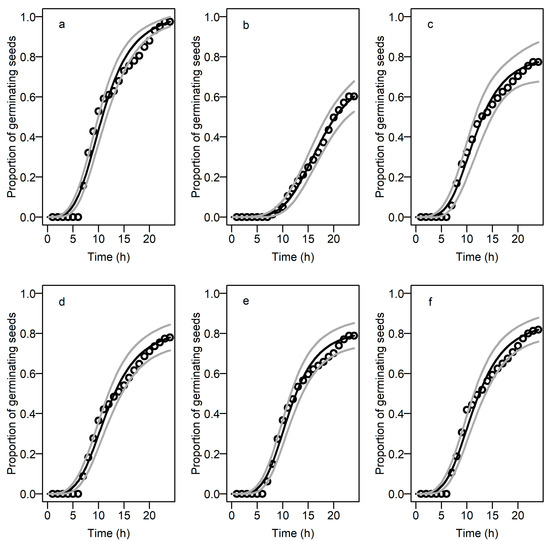 Seed germination proportion of Chinese cabbage over time in composts at different composting time in the treatment T2. (a) CK (deionized water), (b) composts at day 7, (c) day 14, (d) day 21, (e) day 35, and (f) day 70. Gray curves represent 95% confidence intervals.