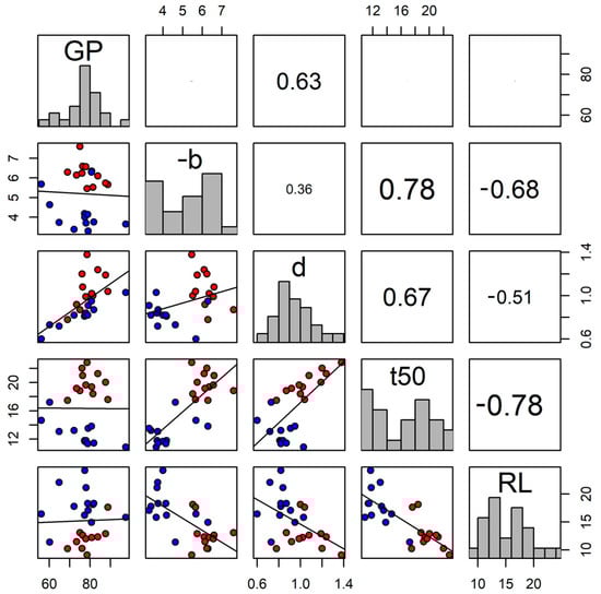 Correlation matrix among the parameters from the seed germination model and the indicators from seed germination and radicle elongation. Red circles and blue circles represent the indicators from Chinese cabbage seeds and garden cress seeds, respectively. The matrix at the diagonal line is the histogram of each parameter or indicator; d, the maximum proportion of seed germination that can be achieved in test; t50, the germination time of half the seeds; −b, a constant and its value directly proportional to the slope of the curve of germination proportion over time at the point t50; GP, the seed germination proportion at the end of test; and RL, radicle length.