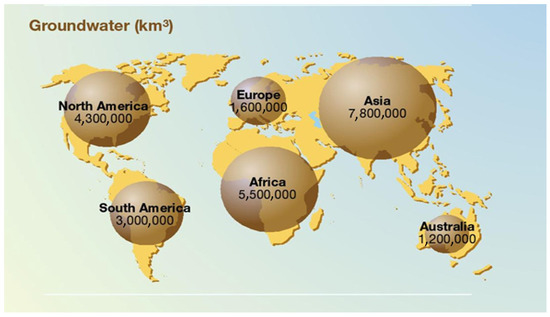 In the humid tropical and equatorial zone, groundwater resources are normally copious, but their distribution is more irregular due to the presence of old geological formations that often compose aquifers with limited storage []. They can only compete with surface water for satisfying geographically dispersed demand, due to their typically superior qualities. Even if aquifers are available, permafrost conditions in the arctic and subarctic zones of the Northern Hemisphere severely limit the availability of groundwater supplies [,]. Permafrost conditions may extend to depths of several hundred meters, obstructing recharge and restricting access to groundwater. The groundwater potential of the Asian continent is the greatest in the world, followed by that of Africa and North America, and then by that of South America, Europe, and Australia in that order. Figure 1 shows the illustrative view of the groundwater potential with different continents []. Herein, the detailed description of the different countries’ groundwater potential from multiple continents are included.
