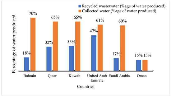Both the rapid increase in the global population and climate change depleted natural resources and intensified water crises. Depletion of water resources directly affects agricultural production and escalates food insecurity. Under these circumstances, governments face pressure to establish a policy to lessen food insecurity by preserving water resources. Although several countries are confronting water crises, Gulf countries are highly susceptible to water insecurity. From this perspective, Saudi Arabia is trying to meet water demand by adapting various parameters such as the collection and recycling of wastewater, though not to a high extent, as shown in Figure 2. According to the World Bank report, in 2017 [], Saudi Arabia produced 17% of water through the recycling of wastewater and 60% of water by collecting wastewater, which is less than other Gulf countries, as mentioned in Figure 1. Since 1980, water consumption in Saudi Arabia has increased by a factor of fifteen [].