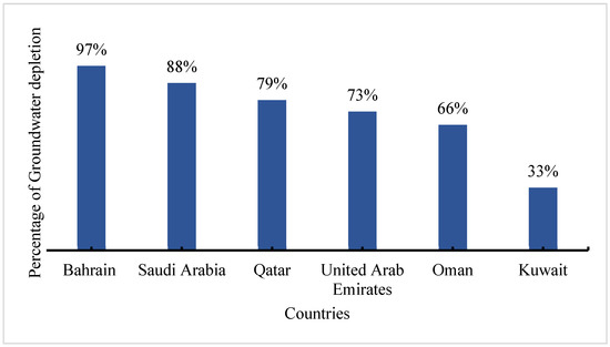 Saudi Arabia highly relied on groundwater and is considered an unsustainable water hotspot. Currently, depletion in groundwater coupled with pollution risks arises from agricultural activities, industrial and landfill wastes, and encroachment of the seawater degrading the quality of groundwater []. Despite being limitless, groundwater extraction for agriculture only contributed to 2% of the GCC country’s GDP. Free allocation, the absence of water rights, and taxes provoked flood irrigation, which elevates evaporation. Several farmers used to cultivate water-intensive crops that can be imported at reasonable prices. In Eastern Saudi Arabia, high water pumping has disorganized the equilibrium between aquifers, which could adversely affect water quality through leakage of low-quality water from one aquifer to another []. Domestic consumption also causes water stress as the authors of [] reported that almost 300 L of water per capita are consumed in Saudi Arabia. Inappropriate practices depleted 88% of groundwater in Saudi Arabia, as Figure 3 shows [].