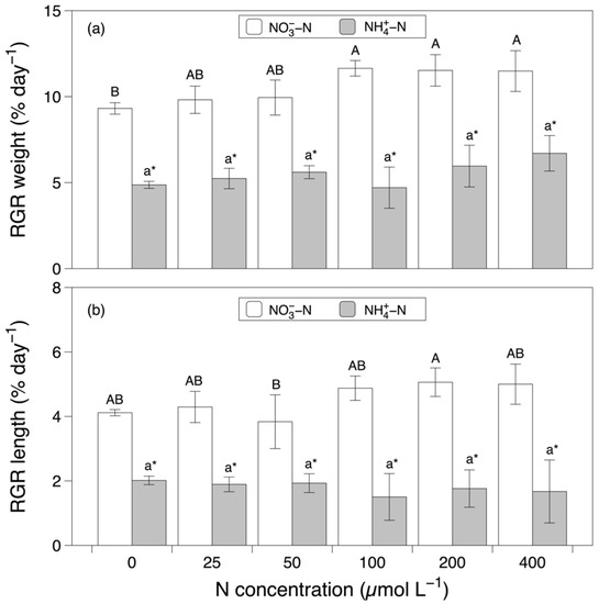 The RGR of the fresh weight was significantly affected by the nitrogen source and concentration both individually and interactively (nitrogen source effect, F = 424.706, p < 0.001; nitrogen concentration effect, F = 6.016, p < 0.001, interaction effect, F = 2.769, p < 0.05; Figure 1a and Table 1). The RGR of the fresh weight in the NO3−-N-based media was significantly higher than that in the NH4+-N-based media. In the media supplemented with NO3−-N, the RGR of the fresh weight increased significantly with increasing concentrations of NO3−-N. In contrast, the RGR of the fresh weight did not vary significantly in the NH4+-N-based media. The RGR of the length was significantly affected by the nitrogen source (F = 296.339, p < 0.001) and the interaction between the nitrogen source and concentration (F = 3.013, p < 0.05; Figure 1b and Table 1). Similar to the RGR of the fresh weight, the RGR of the length in the NO3−-N-based media was significantly higher than that in the NH4+-N-based media. In the NO3−-N-based media, the highest RGR of the length was at 200 µmol L−1. No differences in the RGRs of the length were found between concentrations in the NH4+-N-based media.