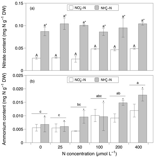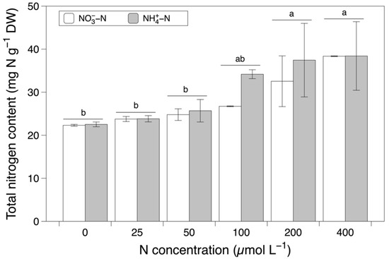 The total nitrogen content was significantly affected by the nitrogen concentration (F = 11.980, p < 0.001; Figure 2 and Table 1). The values of the total nitrogen content increased significantly from concentrations between 0 and 50 µmol L−1 to concentrations between 200 and 400 µmol L−1. With respect to the content of nitrate, the main effect of the nitrogen source (F = 276.252, p < 0.001) and the interaction between the nitrogen source and concentration (F = 2.937, p < 0.05) were significant. After the pairwise comparisons, a significant difference between concentrations could not be detected. The nitrate content in the NO3−-N-based media was significantly lower than that in the NH4+-N-based media (Figure 3a). The content of ammonium was significantly affected by both the nitrogen source and concentration individually (nitrogen source effect, F = 10.341, p < 0.05; nitrogen concentration effect, F = 10.127, p < 0.001). Consistent with the results for nitrate content, the NO3−-N-based media led to significantly lower values of the ammonium content compared to the NH4+-N-based media (Figure 3b). The ammonium content was highest with a concentration of 400 µmol L−1, followed by 100 and 200 µmol L−1, and significantly higher than the values observed with concentrations between 0 and 50 µmol L−1.