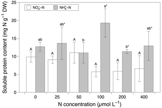 The soluble protein content was significantly affected by the nitrogen source (F = 40.958, p < 0.001) and the interaction between the nitrogen source and concentration (F = 37.865, p < 0.05; Figure 4 and Table 1). The NH4+-N-based media induced significantly higher contents of soluble protein compared to the NO3−-N-based media at concentrations of 25, 100, 200, and 400 µmol L−1. Various nitrogen concentrations from the same nitrogen source resulted in different trends in the soluble protein contents. In the NO3−-N-based media, no differences in the soluble protein contents were found between the different concentrations. In contrast, a concentration of 100 µmol L−1 resulted in the highest soluble protein content with the NH4+-N based media.