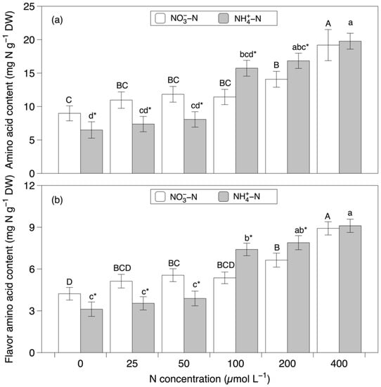 Amino acid (a) and flavor amino acid (b) contents in Grateloupia turuturu after 28 days of cultivation under a combination of two nitrogen sources at six concentrations. Data represent the mean ± SD. As the interaction effect was significant, different capital and small letters indicate significant differences among the concentrations in nitrate and ammonium media, respectively. Asterisks indicate significant differences between nitrogen sources at each concentration (p < 0.05).