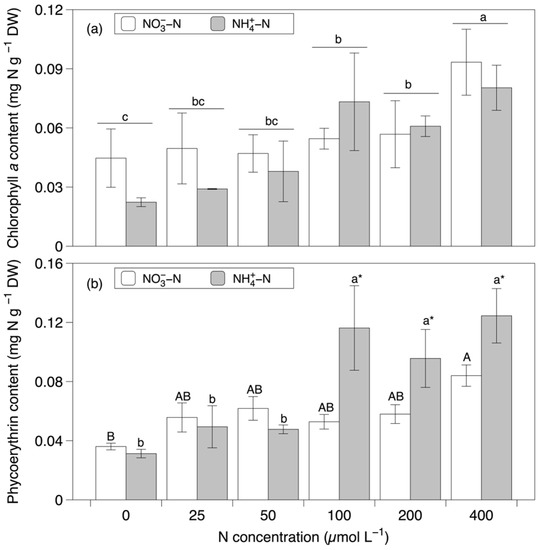 The chlorophyll a (a) and phycoerythrin (b) contents in Grateloupia turuturu after 28 days of cultivation under a combination of two nitrogen sources at six concentrations. Data represent the mean ± SD. As the interaction effect was significant for phycoerythrin, different capital and small letters indicate significant differences among concentrations in the nitrate and ammonium media, respectively. Asterisks indicate significant differences between nitrogen sources at each concentration (p < 0.05). For chlorophyll a, different small letters indicate significant differences between concentrations, irrespective of the nitrogen source (p < 0.05).