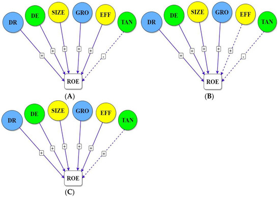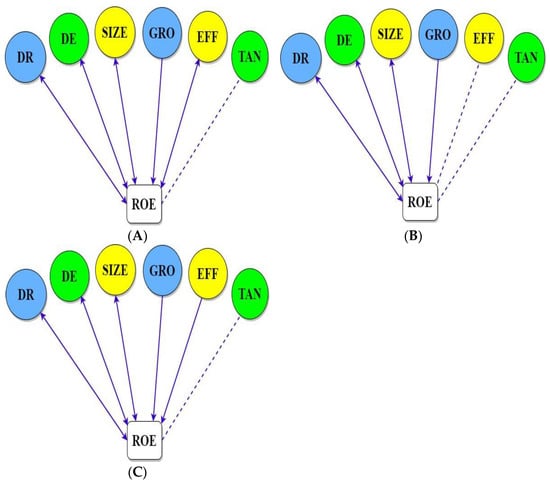 Elastic effects of DR, DE, SIZE, GRO, EFF and TAN on ROE. Note: ROE is the dependent variable. (A) represents the long-term elasticities for firms in consumer goods (CG), (B) denotes the long-term elasticities for firms in non-consumer goods (CG) and (C) indicates the long-term elasticities of the whole sample. Also, (+) denote positive influence on ROE, whilst (−) signifies negative influence on ROE. Finally, (→) represents significant effect on ROE, whilst (⇢) symbolizes insignificant effect on ROE.