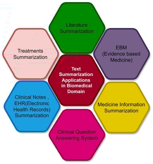 As shown in Figure 1 there are multiple application areas of TS in the biomedical area such as scientific literature summarization [4,6,7], treatments information summarization [11], medicine information summarization [14], EBM practice and clinical decision making [15,16,17], summarization of patient’s clinical summary notes [18], summarization of patients electronic medical records (EMR), EHR summarization [12], etc., are addressed. An effective biomedical text summarization method should be able to handle the diversities and generate meaningful insights for clinicians, researchers as well as patients by addressing these challenges in the biomedical domain.