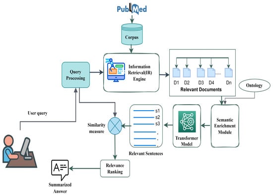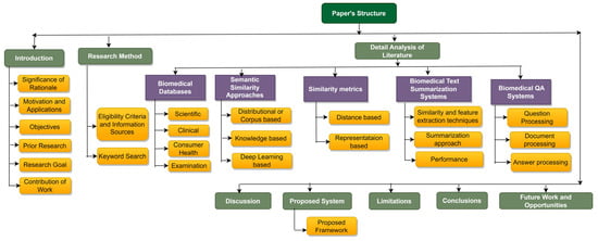 According to the literature, a lot of work is done on semantic analysis in biomedical text, which offers great potential for identifying semantic relationships between biomedical entities, terms, and terminologies [52,53]. Semantic analysis in the biomedical domain employs multiple NLP tasks, including WSD [54], clustering [55], ontology learning [56], information retrieval [33], text classification [57], question answering [39,41,42], text Summarization [58], topic detection [58], and many others. Extracting semantic similarity implies determining and quantifying the contextual relationship between concepts based on shared features. The calculation of semantic similarity between text components can be carried out with data recovery from different biomedical sources [19,46,47,48,49,50,51], heterogeneous data integration [59] automatic grouping of semantically related clinical terms [60], and clinical model clustering from patient EHR [56] in the domain. To find the similarity between any two texts, traditional frequency-based techniques [61,62] can be employed. However, to avoid misinterpretations in the biomedical sector, it is vital to assure not just explicit relevance between two-word sequences, but as well as the underlying clinical setting. As a result, research into semantic similarity techniques is critical in this field. For instance, because they are both respiratory system ailments, “bronchitis” and “influenza” have semantic similarities.