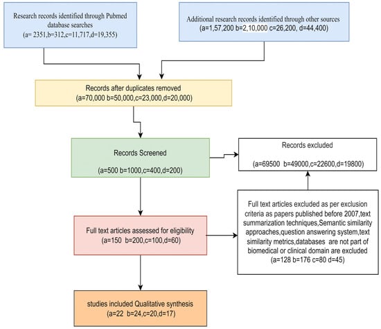 The PRISMA stream chart for precise audit specifying look, the number of modified works/records screened, and the quantity of full-text articles recovered where a = biomedical text summarization, b = semantic similarity, c = biomedical question answering, d = similarity metric.