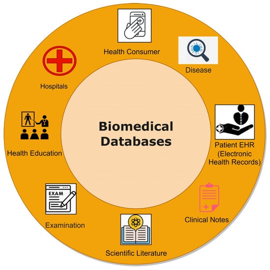 As shown in Figure 4, there are different forms of biomedical information. Because of the constant advancement in biomedical research and development in the recent decade, the volume of biomedical literature and patient EHR, and EMR articles is getting enormous. As a result, it is extremely difficult for doctors, patients, and clinical researchers in biomedical-related disciplines to construct their own knowledge base and keep it up to date on a daily basis by identifying all the relevant literature that is released. For EBM practice, clinicians should know about the latest clinical proof for diagnosing and treating patients’ infirmities [15] in order to give optimal patient care as well as the general public interest in obtaining their own health on the Internet. Biomedical information procurement is a basic errand with regard to data recovery and information, so biomedical experts and the overall population, for instance, need important help in recovering, deciphering, and incorporating applicable data from numerous biomedical information sources. Clinicians must be able to search for and obtain the most recent clinical data, as well as keep up with the recent advancements in their field of expertise, in order to follow EBM. Electrical possessions, for example, online biomedical works databases, EHR, and EMR systems have been developed to assist biomedical researchers, doctors, and patients with their information management needs. Each scientific work is documented in data produced according to guidelines established by a number of scientific associations and institutions [40].
