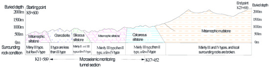 The rock burst microseismic monitoring system can monitor the rock burst by monitoring the micro fracture generated in the process of the stress release of the rock mass. The microseismic monitoring method was initially mainly used in the mining field. In recent years, some deep buried water tunnels in China have also adopted microseismic methods to monitor and warn of rock bursts [], mainly including the Jinping II Hydropower Station Project, Xinjiang ABH Project, and Shaanxi Yinhanjiwei Project.