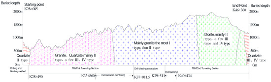 The Yinhanjiwei Project is located in the Qinling Mountains in south central Shaanxi Province, with a total length of 98.3 km. It is jointly excavated by the drilling and blasting method and two open TBMs with a diameter of 8.0 m. The Lingnan section of the bid section under study is planned to be constructed with a total length of 18.28 km. The excavation stake number is K28+085~K46+360. The stake number K28+490~K37+011.5 is the first TBM excavation section, and the stake number K39+511~K46+360 is the second TBM excavation section. The elevation of the tunnel ranges from 1050 to 2420 m, the maximum burial depth is about 2012 m, and the geostress is high. Along the tunnel, there are mainly hard rocks such as quartzite, granite, diorite, etc. The compressive strength of the rocks is 107 to 317 MPa, with an average of about 170 MPa. In the dry and waterless tunnel section, there are conditions for strong rock burst [].