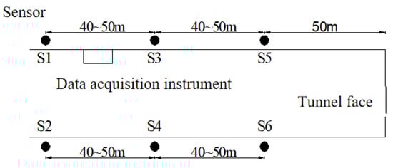 The rock burst microseismic monitoring system in a TBM construction project is generally composed of one Paladin data acquisition instrument, six acceleration sensors, and one monitoring host [,]. Three monitoring sections are arranged in the direction of the tunnel axis, each section is equipped with two sensors, and the spacing of the monitoring sections is 40~50 m. This can be adjusted flexibly according to the specific construction situation on site, but at least four sensors will work normally. The monitoring host system and the receiving substation are placed on the TBM trolley, and the sensors are connected with the substation by communication cables. The substation and host processing system are connected by an optical fiber to realize signal transmission. The microseismic monitoring system monitors the rock burst in real-time as the working face advances. The monitoring system layout is shown in Figure 3.