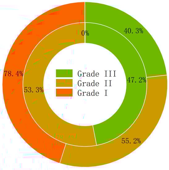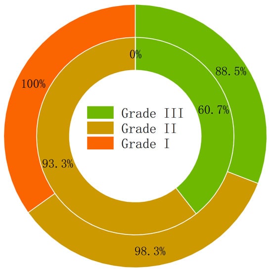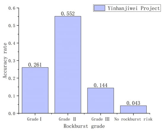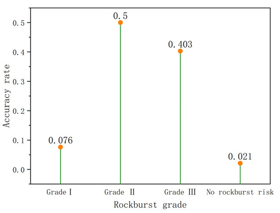 The rock burst occurred in the supporting project should be classified according to the construction risk level, and the early warning results of the microseismic monitoring system before the occurrence of Grade III, II and I rock bursts are counted respectively. In this way, the accuracy of the rock burst risk prediction can be obtained, as shown in Figure 4.