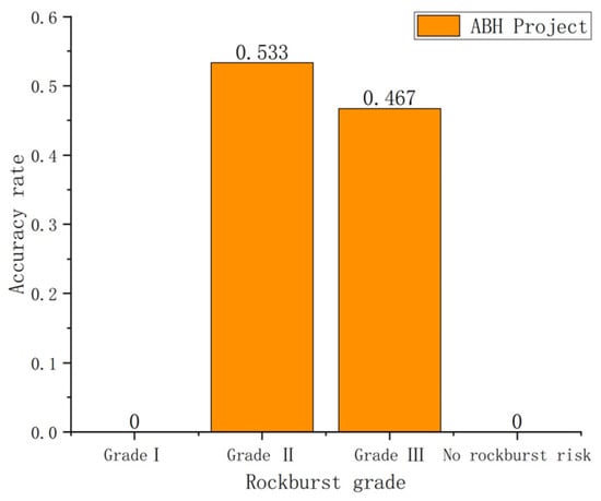It can be seen from Figure 4 that for Grade III and Grade II rock bursts, the accuracy of rock burst risk prediction for the ABH Project and Yinhanjiwei Project at the same level was not different, and the accuracy was relatively low at 47.2% and 40.3% for Grade III and 53.3% and 55.2% for Grade II, respectively. Regarding the Grade I rock burst, the ABH Project has not experienced it yet. The prediction accuracy of the Yinhanjiwei Project was 78.4%, reaching a high level. Based on the results of the rock burst prediction of the two projects, it was found that with the increase in the rock burst risk level, the prediction accuracy of the microseismic monitoring system gradually improved.