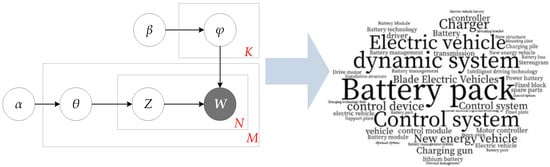 Referring to the common practice of scholars, this study uses patent data to build the innovative networks [23,24]. Considering that SAIC, Geely and other companies are traditional automobile companies, the data collected may include patents related to traditional automobile manufacturing. This study uses the LDA model, divides the title, IPC, abstract and other text content of the patent data, statistics the high-frequency words closely related to the technology, and excavates the technical hot-spots in the field of NEV (see Figure 2). Through the comparison of IPC, the number of patents of battery (H01M,H02J), the electric drive (B60L,B60K) and electronic control (H02P) account for more than 70%, which are pivotal technologies to promote the development of NEV. Therefore, this study combines the technical hot-spots and IPC to determine the patent retrieval formula, expand the data scope [12], and ensure the integrity of the samples.