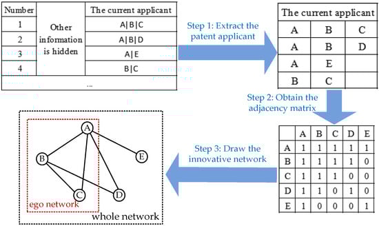 The second step is to obtain the adjacency matrix. Through joint patent applications, the cooperative relationship between the participants is extracted and the 0–1 relationship matrix is constructed.